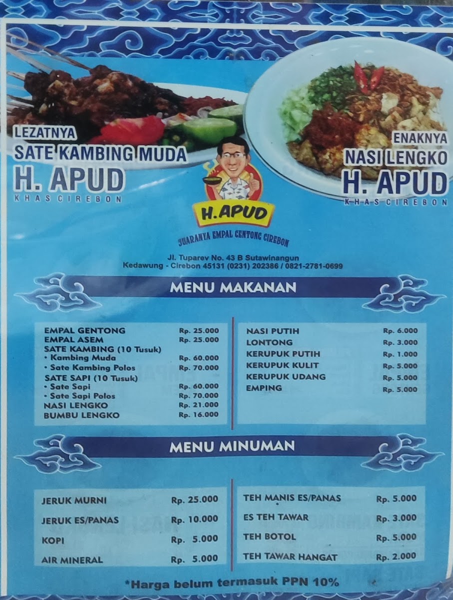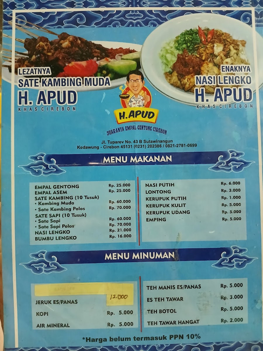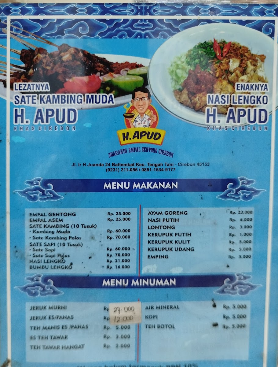 Welcome to Empal Gentong H. Apud, a culinary gem located in Cirebon, Jawa Barat, renowned for its authentic take on traditional Indonesian cuisine. The highlight of the menu is undoubtedly the Empal Gentong, a rich, coconut milk-based beef soup celebrated for its depth of flavor. Diners also rave about the equally delectable Empal Asem, a clear, sour soup that refreshes the palate. Beyond soups, the restaurant offers tantalizing dishes like the Sate Kambing (young goat satay), which is tender, juicy, and perfectly spiced, often paired with a unique chili sambal.